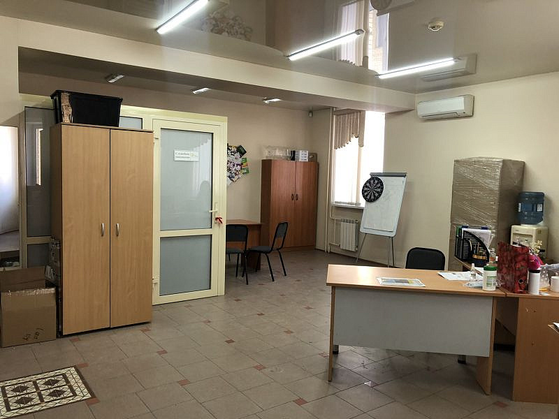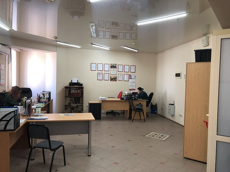 Площадь 56 кв.м. Открытая планировка. Отгорожена небольшая переговорная - можно использовать как отдельный кабинет, склад. При необходимости легко демонтируется. В офисе хороший, качественный ремонт: на полу плитка, натяжные потолки с точечным освещением, установлены кондиционер, охранная сигнализация и противопожарная системы, заведены телефонная и интернет линии.