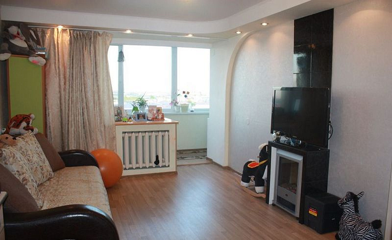 В комнате: потолок - гипсокартон+натяжной, стены выровнены - обои, пол - ламинат (33 класс Tarkett). Все межкомнатные двери новые. В кухне (10 кв. м) и прихожей на полу линолеум (полукоммерческий Tarkett), на кухне новый гарнитур (остается новому собственнику), под окном сделан шкаф в цвет гарнитура. Санузлы: вся сантехника новая (раковина, шкаф, унитаз, ванна), кафель.