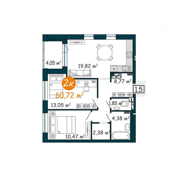 2-к квартира в новостройке, 60 кв.м., Краснооктябрьская улица, 8