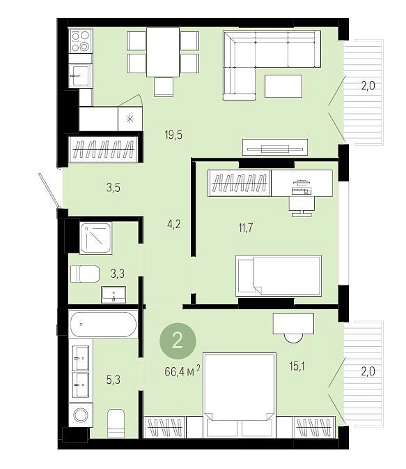 2-к квартира в новостройке, 66 кв.м., квартал Новин
