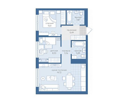 2-к квартира в новостройке, 54 кв.м., микрорайон Тюменская Слобода