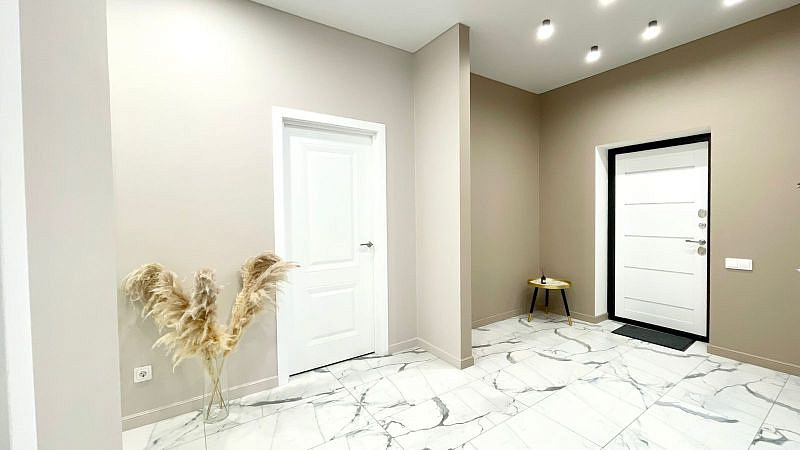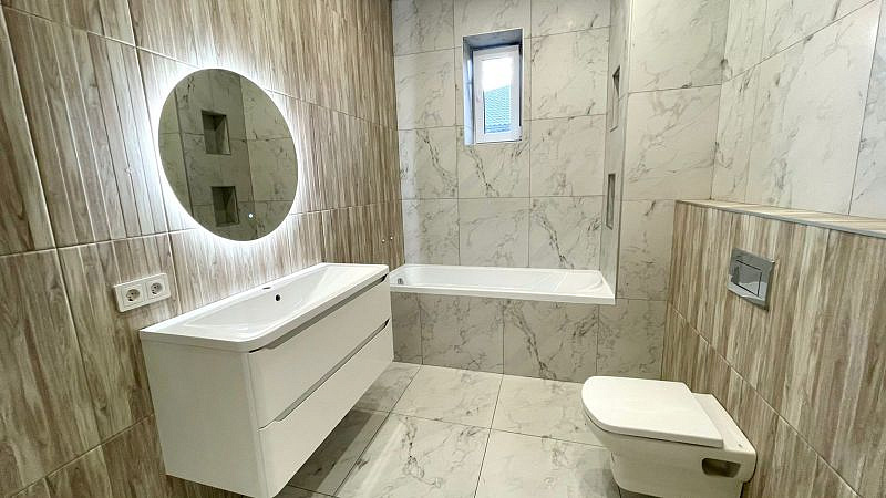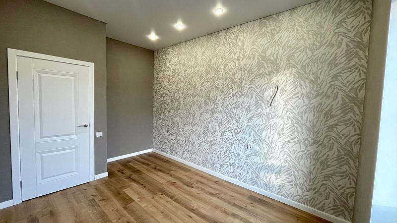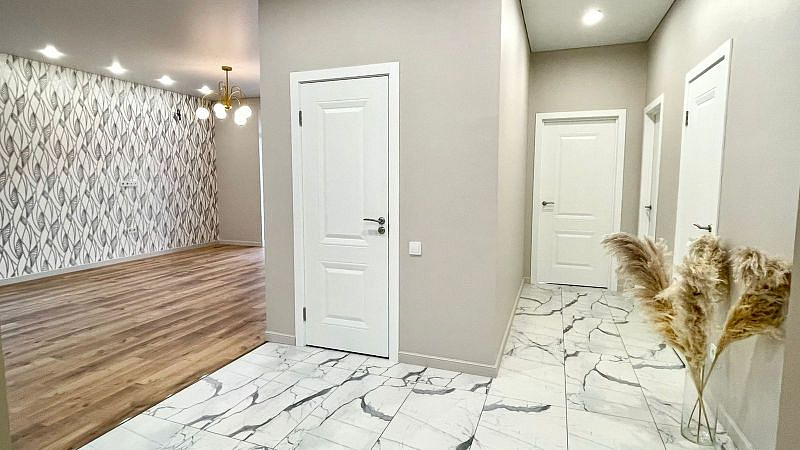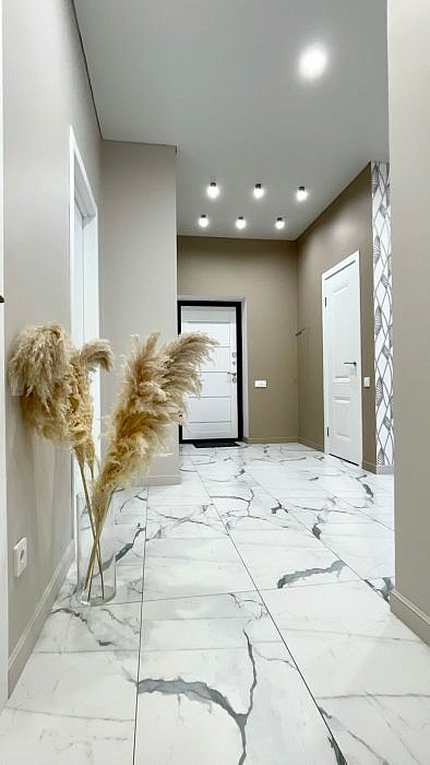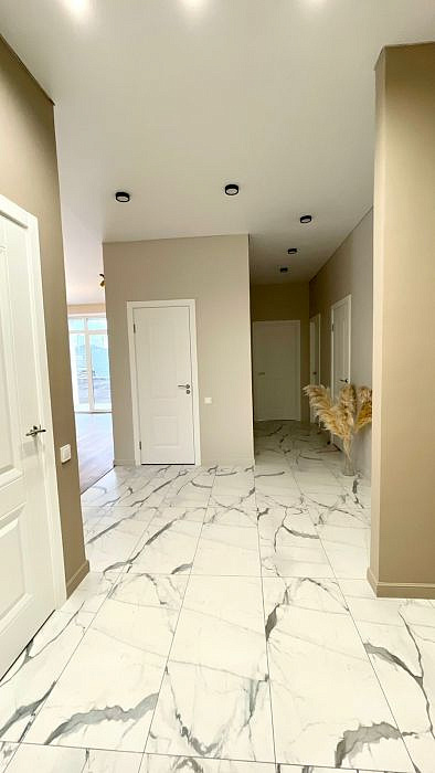Керамогранит на полу в холле и санузлах. Санузлы оборудованы инсталляциями Roca с унитазом, тумбы с раковиной, ванной, зеркалами. Малярный флизелин на стенах окрашен в нейтральный пастельный тон. На акцентных стенах обои и декоративные панели. На полу ламинат 33 класса в гостиной жилых комнатах. Красивая люстра в гостиной, бра, точечный свет по всему дому, матовый натяжной потолок. Белый ударопрочный окрашенный плинтус. Розеток много и все продуманы, делаем все как для себя, а не для продажи, чтобы было удобно качественно и надежно!