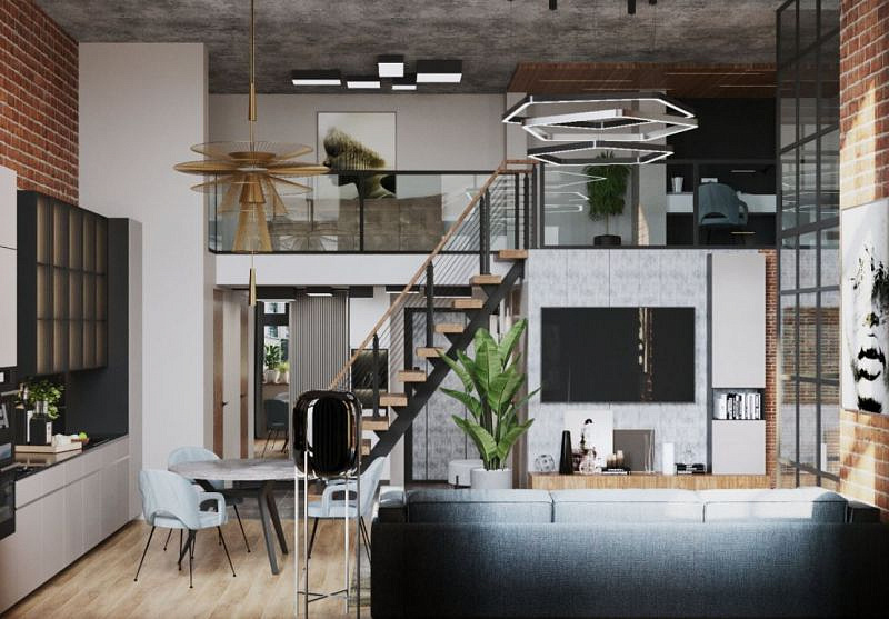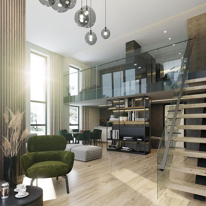 Одна из «фишек» проекта – ультрамодные сити-хаусы, квартиры с антресолями. Их отличительной особенностью является высота потолка в 4,5 метра, панорамное остекление окон, отдельный вход со двора и собственная терраса.